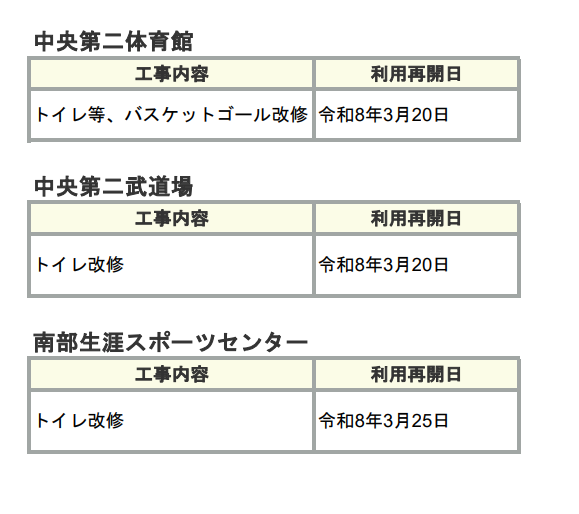下記のスポーツ施設の改修工事完了に伴い利用を再開いたします。
